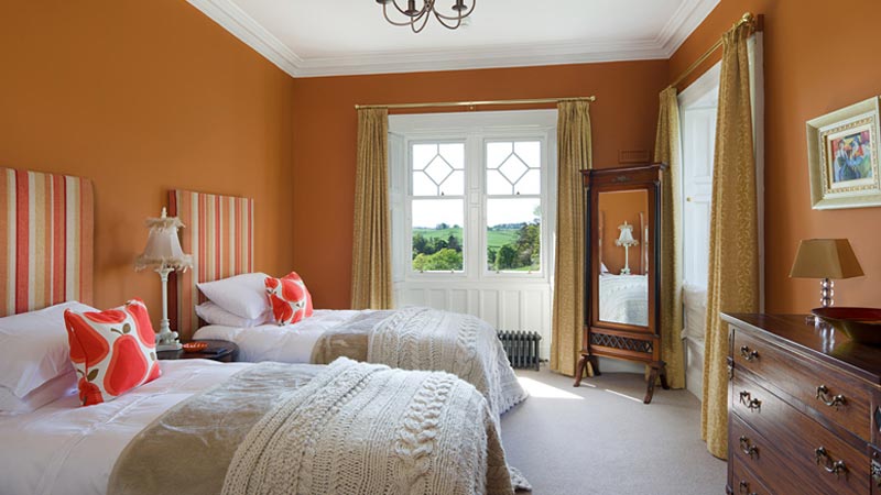 Bright and airy room on the first floor with dual aspect over the stunning west facing walled garden and formal lawns. Restored working shutters to all windows, twin beds, window seat to window looking over the formal lawns.
